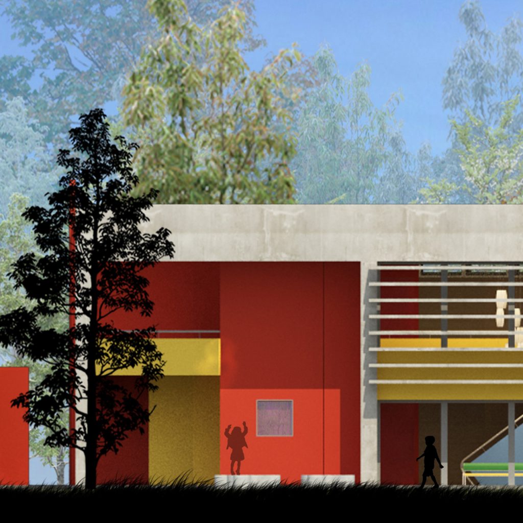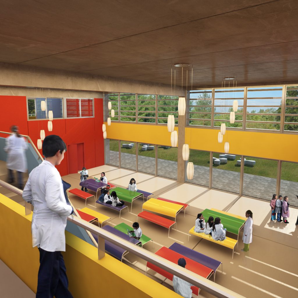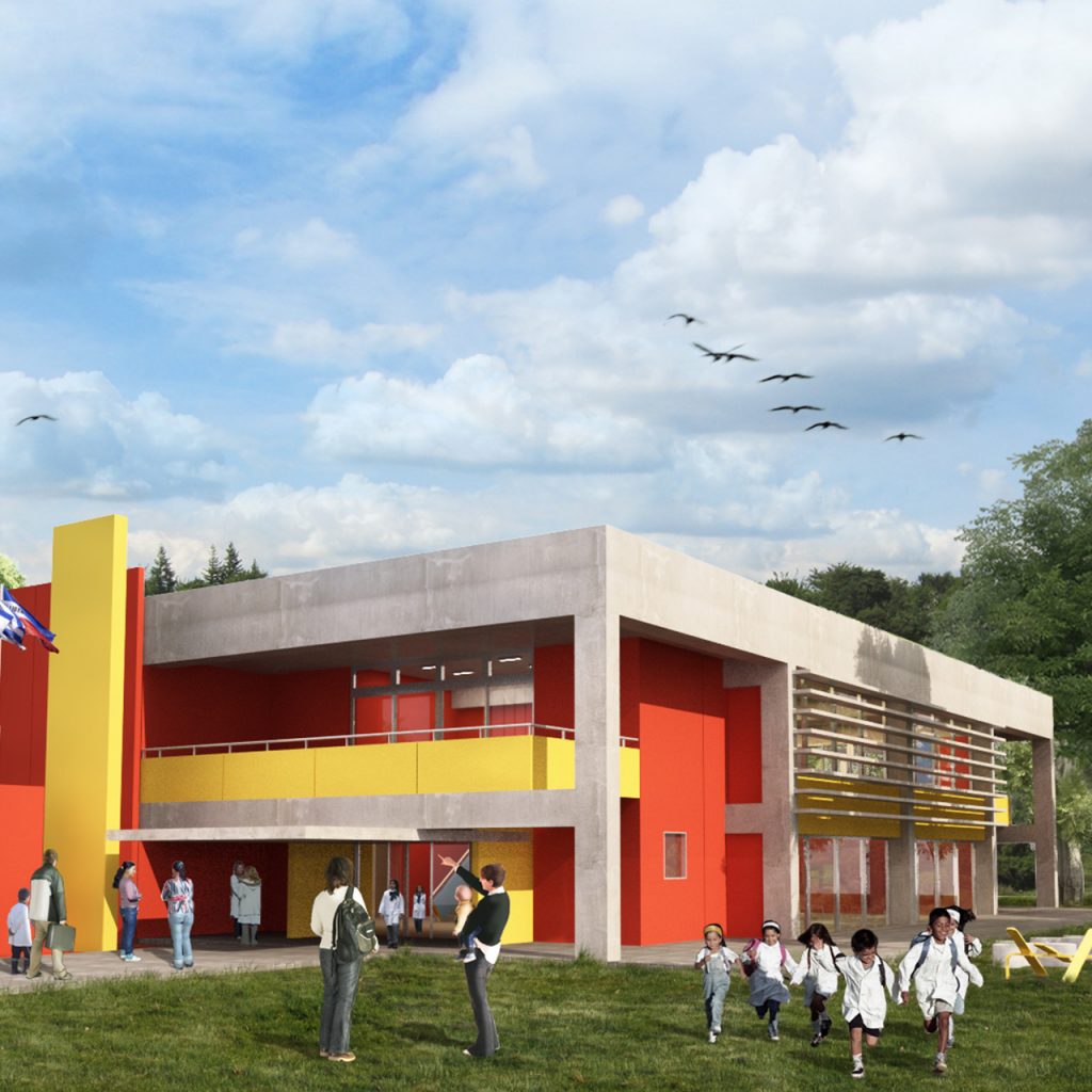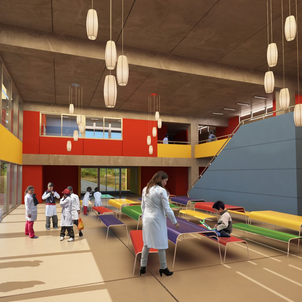 Prototype for full-time school. It features eight classrooms, administrative and services areas, a multipurpose room/dining room, a kitchen, an access hall and a courtyard.