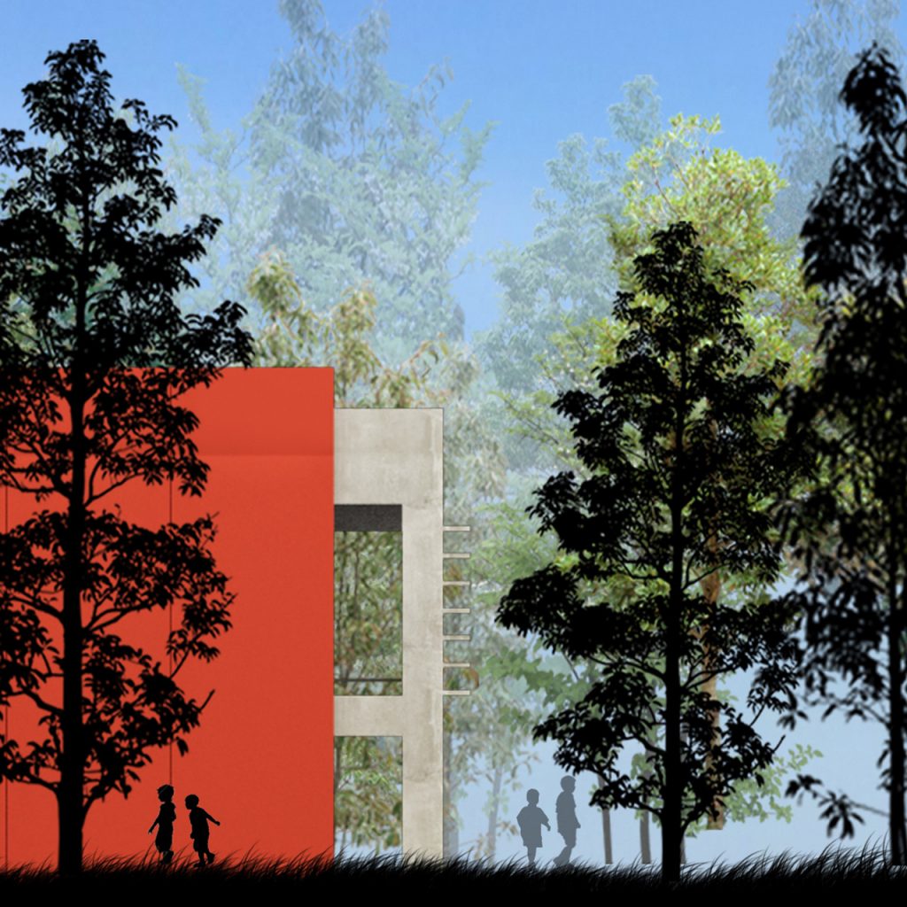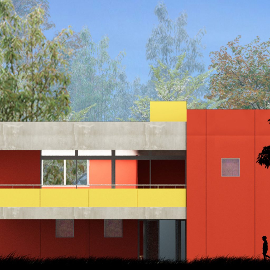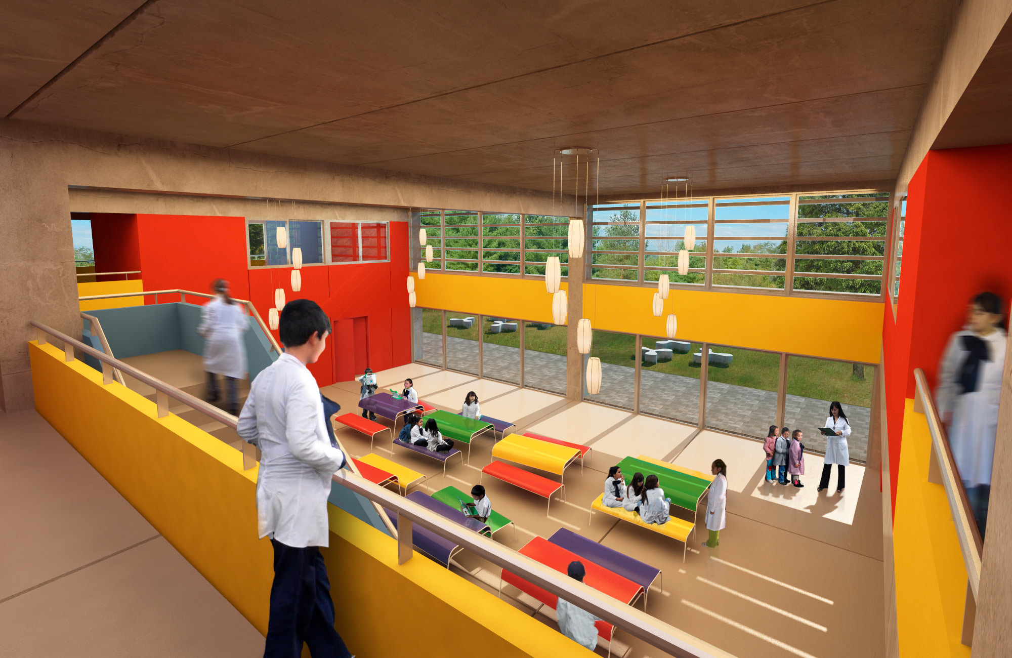 Prototype for full-time school. It features eight classrooms, administrative and services areas, a multipurpose room/dining room, a kitchen, an access hall and a courtyard.