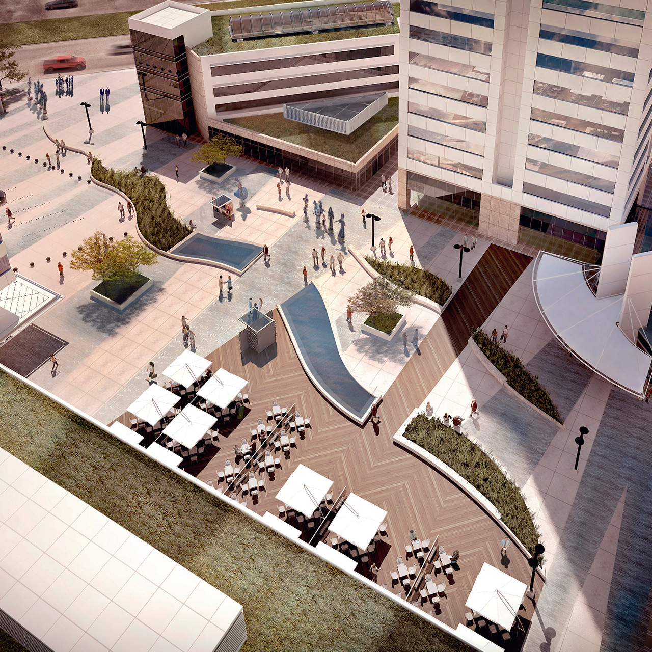 Plaza pública desarrollada en el área abierta entre los edificios que conforman el World Trade Center con un paseo de las esculturas y una plaza de comidas.